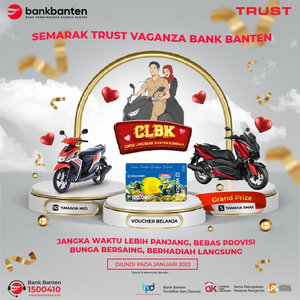 Berbagai keuntungan dan hadiah menarik telah dipersiapkan dalam Program CLBK dengan tajuk semarak TRUST Vaganza Bank Banten ini. Keuntungan seperti jangka waktu kredit yang lebih panjang, pembebasan biaya provisi berikut hadiah seperti 5 unit Yamaha X-Max, 10 unit Yamaha Mio hingga Ribuan Voucher Belanja senilai total ratusan juta rupiah telah disiapkan pada program yang akan berlangsung hingga akhir 2021 tersebut.