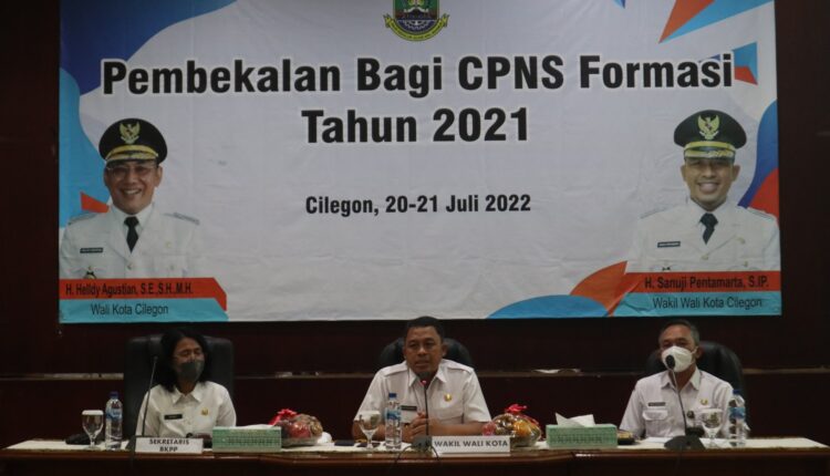 CILEGON – Wakil Walikota Cilegon, Sanuji Pentamarta memberikan arahan pada Pembekalan Calon Pegawai Negeri Sipil (CPNS) Formasi 2021 yang berlangsung di aula Sekretariat Daerah (Setda) II Kota Cilegon, Rabu (20/07/2022).
