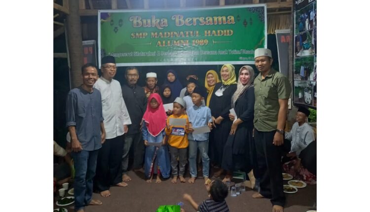 CILEGON – Puluhan alumni Sekolah Menengah Pertama (SMP) Swasta Madinatul Hadid angkatan 1989 menggelar reuni dibarengi dengan buka puasa bersama dan santunan anak yatim di Sekretariat Pagem, lingkungan Kubang Lesung, Kelurahan Taman Baru, Kecamatan Citangkil, Jumat, (28/4/2022) lalu.