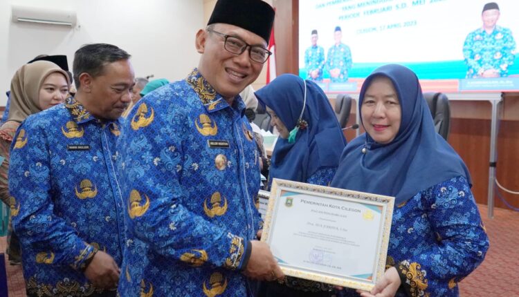 CILEGON – Wali Kota Cilegon Helldy Agustian memberikan penghargaan kepada 66 orang Pegawai Negeri Sipil (PNS) di lingkungan Pemerintah Kota (Pemkot) Cilegon yang telah memasuki Batas Usia Pensiun (BUP) periode Februari hingga Mei 2023 di Aula Setda II Kota Cilegon, Senin (17/4/2023).