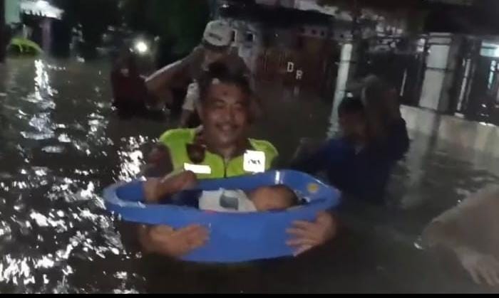 CILEGON – Kepala Satuan Pembinaan Masyarakat (Kasatbinmas) Polres Cilegon, Iptu Muhyidin, membantu mengevakuasi seorang bayi bersama sejumlah warga yang terdampak banjir di kawasan Komplek Metro, Kota Cilegon, Sabtu (7/3/2026) malam.