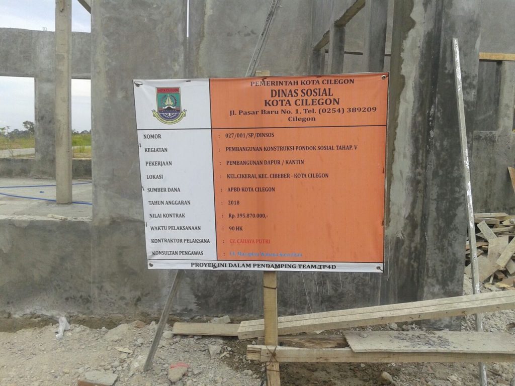 Dari pantauan langsung faktabanten.co.id Sabtu (19/5/2018) siang, tampak sudah berdiri bangunan dua gedung yang anggarannya bersumber dari PAD Kota Cilegon tersebut, yakni pembangunan gedung Aula, Nomor kontrak 027/002/SPMK/DINSOS, dengan nilai kontrak Rp 585.440.000; kontraktor pelaksana CV Alifia, dan Pembangunan Gedung Dapur/Kantin ber-Nomor kontrak 027/001/SP/DINSOS, dengan nilai kontrak Rp 395.870.000; dengan kontraktor pelaksana CV Cahaya Putri.
