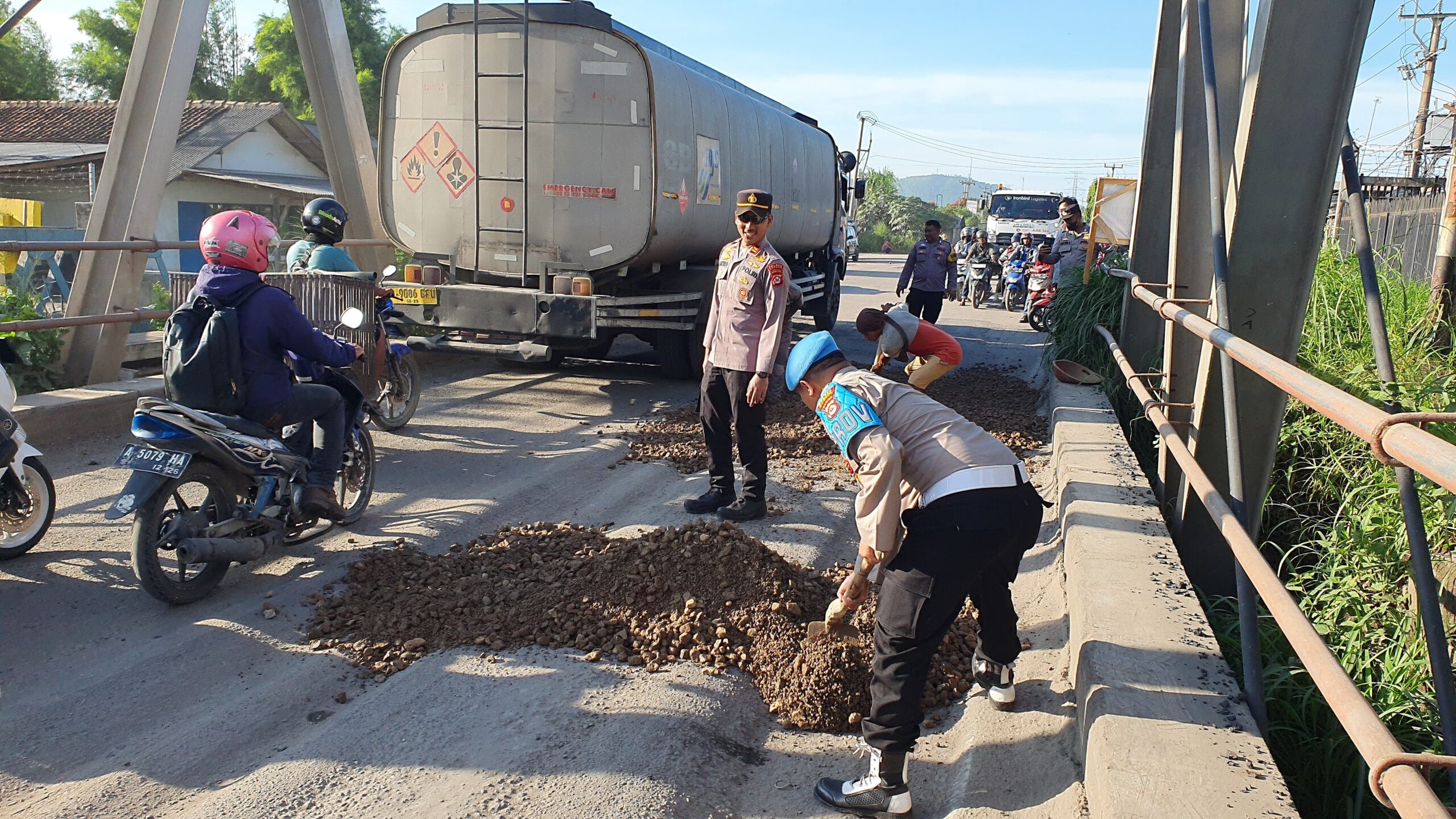 Berbahaya Bagi Pengendara, Jalan Rusak di Bojonegara Ditambal Polisi