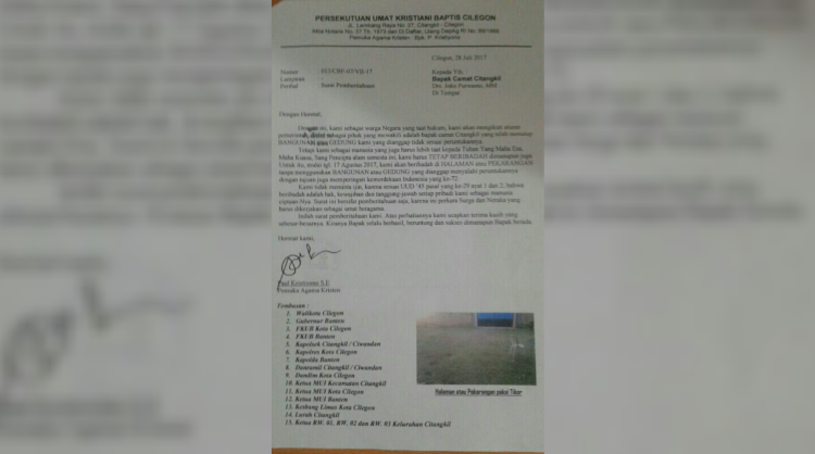 Surat tertanggal 28 Juli 2017 ini di tandatangani oleh Paul Kristiyono, selaku pemuka agama Kristen di Kota Cilegon.
