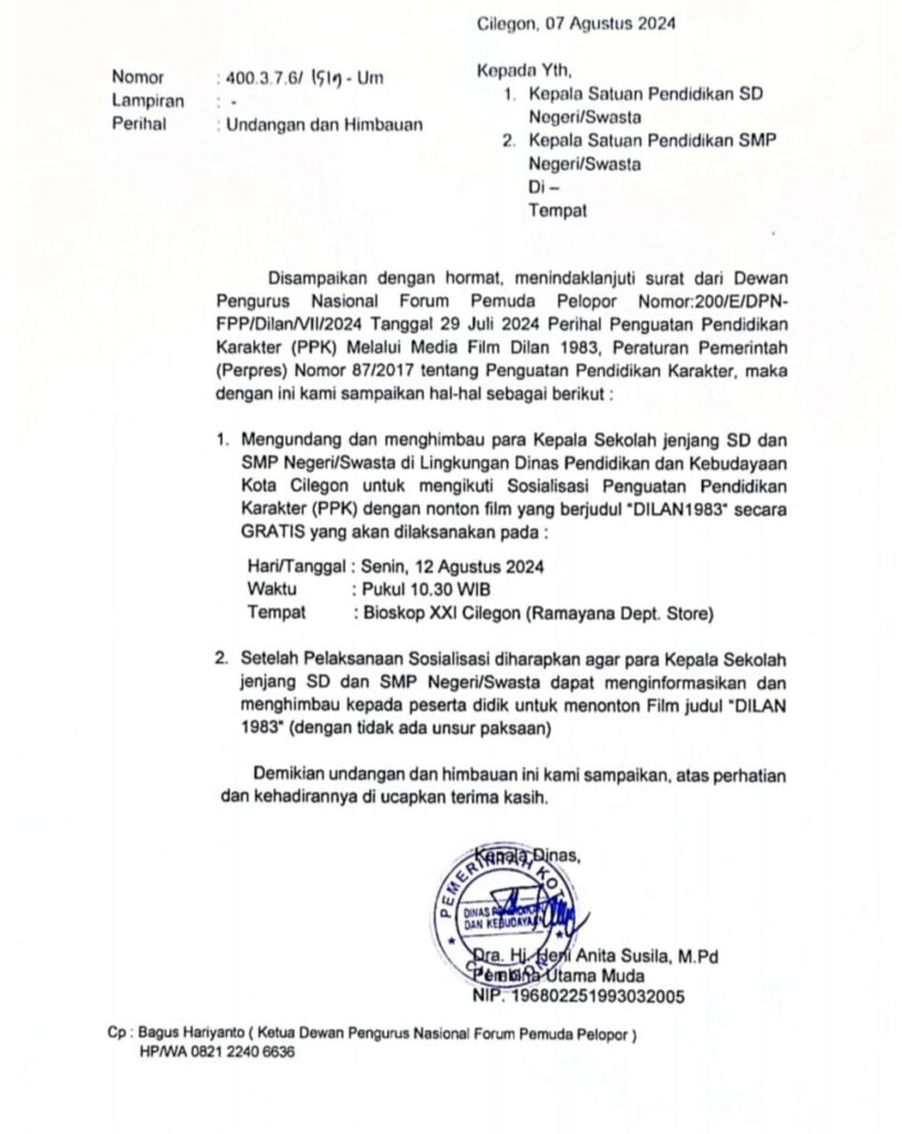 CILEGON – Baru-baru ini beredar Surat Undangan sekaligus Himbauan dari Dinas Pendidikan dan Kebudayaan (Dikbud) Kota Cilegon perihal Program PPK (Penguatan Pendidikan Karakter) dengan mengajak menonton ‘Film Dilan 1983’ yang dikhususkan kepada Kepala SD dan SMP baik negeri maupun swasta di Cilegon.