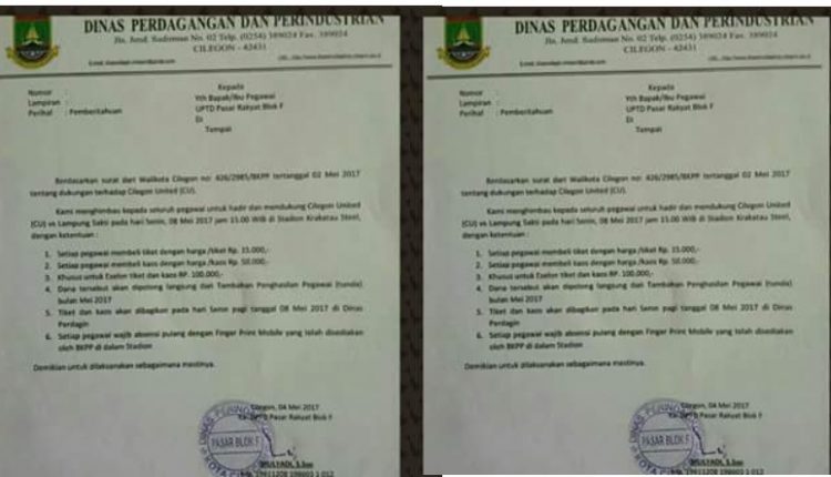 Beredar Surat Dinas Perdagin yang Mewajibkan Pegawainya Beli Tiket dan Kaos Cilegon United