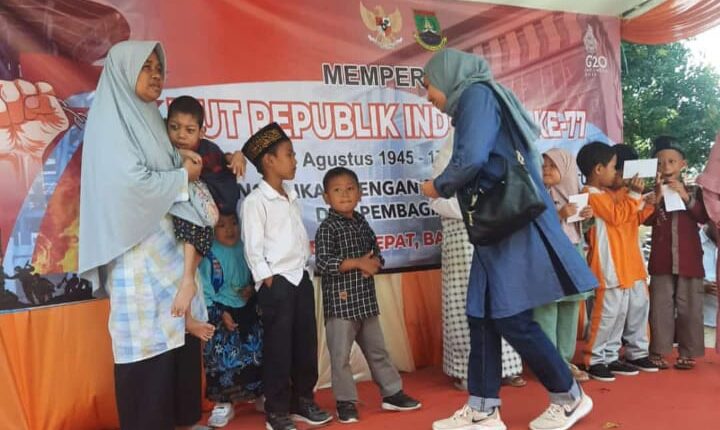 CILEGON – Dalam rangka memeriahkan Hari Ulang Tahun (HUT) Republik Indonesia (RI) ke 77 tahun, Lurah Kelurahan Kalitimbang, Kecamatan Cibeber berikan santunan untuk anak yatim piatu di halaman kantor Kecamatan Cibeber, Kota Cilegon, Jum’at (19/08/2022).
