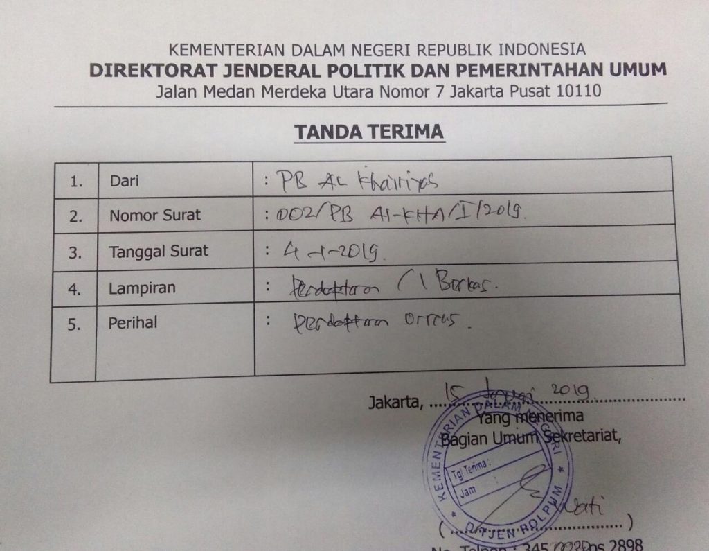 Pengurus Besar (PB) Al-Khairiyah juga telah melakukan pendaftaran badan hukum Ormas tersebut ke Kementerian Dalam Negeri (Kemendagri).