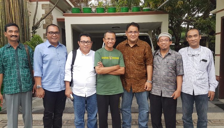 Penasehat Serikat Media Siber Indonesia (SMSI) Dahlan Iskan (kaos hijau) berfoto bersama dengan Ketua Umum SMSI Teguh Santosa (batik coklat) dan Sekjen SMSI Firdaus (kemeja putih) usai pertemuan di kediaman Dahan di Surabaya, Rabu (21/6). Dalam foto juga tampak Ketua PWI Jawa Timur Akhmad Munir (kedua dari kiri), Ketua SMSI Jawa Timur Eko Pamuji (paling kanan) dan Sekretaris SMSI Jawa Timur Makin Rachmad (kedua dari kanan).