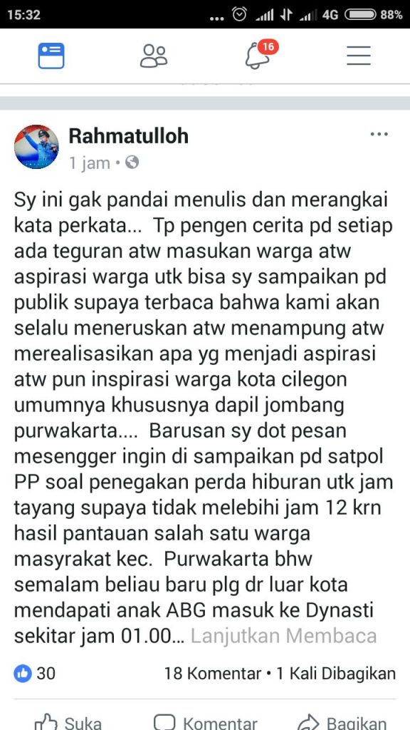 CILEGON – Melalui akun Media Sosial (Medsos) Facebooknya, salah satu anggota DPRD Cilegon Rahmatulloh, menceritakan terkait perannya sebagai perwakilan rakyat yang menerima aduan atau aspirasi warga Cilegon untuk disampaikan agar bisa direalisasikan.