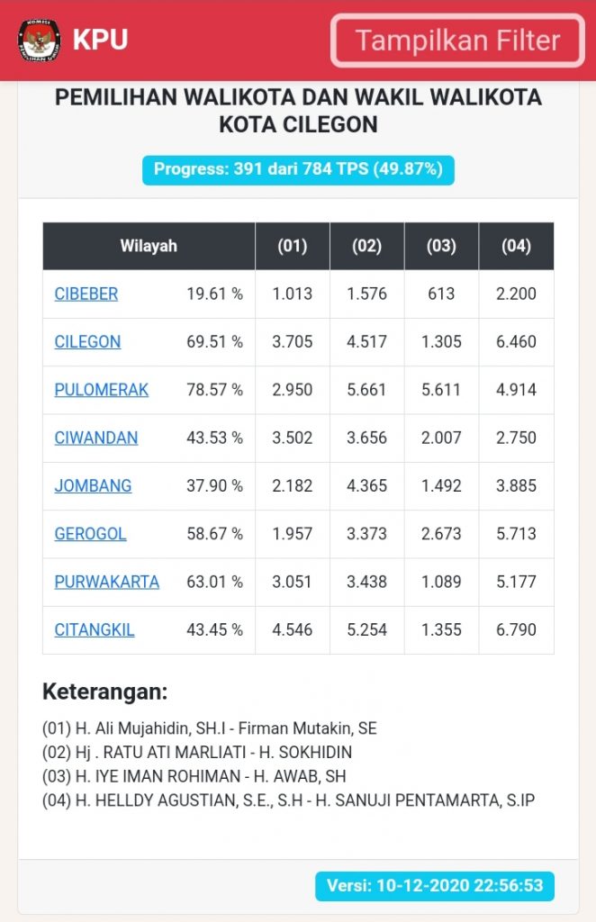 Diketahui, hasil penghitungan suara atau real count Pilkada Cilegon 2020 yang dilakukan oleh KPU ini baru berdasarkan data yang dikumpulkan Kamis (10/12/2020) malam pukul 22.56 hingga Jumat (11/12/2020) pukul 08.30 WIB, baru terdapat 391 jumlah TPS yang dihitung dari 784 TPS di 8 kecamatan se-Kota Cilegon.