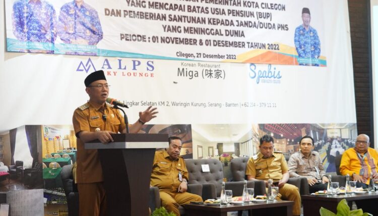 CILEGON – Wali Kota Cilegon Helldy Agustian didampingi Wakil Wali kota Sanuji Pentamarta, Sekretaris Daerah Kota Cilegon Maman Mauludin dan Kepala Dinas BKPSDM Ahmad Jubaedi memberikan penghargaan kepada PNS di Lingkungan Pemerintah Kota Cilegon yang mencapai batas usia pensiun (BUP) dan pemberian santunan kepada janda/duda PNS yang meninggal dunia periode 1 November sampai 1 Desember 2022 yang diselenggarakan di Forbis Hotel, Selasa (27/12/2022).