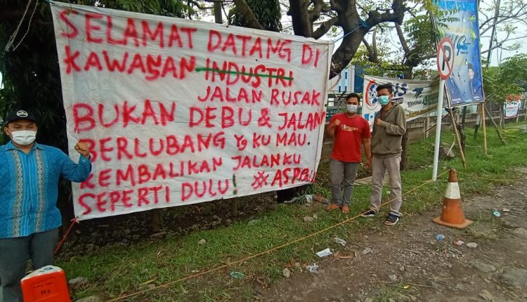 CILEGON – Resah dengan jalan yang penuh lubang dan rusak, beberapa pemuda yg tergabung dalam ASPPAL (Aliansi Pemuda Peduli Lingkungan) Kelurahan Gunung Sugih, Kecamatan Ciwandan Kota Cilegon melakukan aksi unjuk ekspresi melalui pemasangan spanduk.