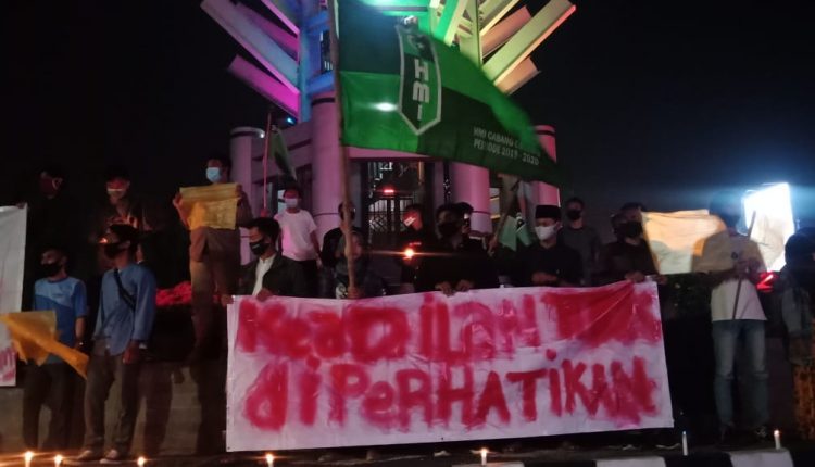 CILEGON – Puluhan mahasiswa yang tergabung dalam Himpunan Mahasiswa Islam (HMI) Cabang Cilegon menggelar aksi damai mimbar bebas, dan bakar lilin di Landmark Cilegon, Pada Selasa (6/10/2020) malam. Sebab, HMI Cilegon merasa kecewa disahkannya UU Omnibus Law Cipta Kerja di tengah pandemi Covid-19.