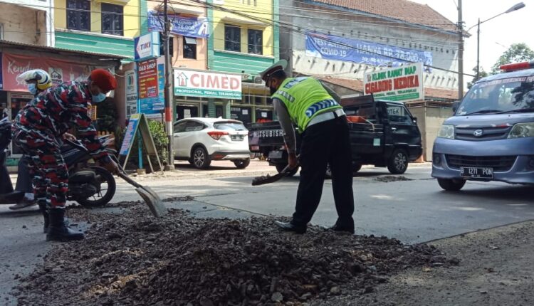 Kerap Sebabkan Kecelakaan, Polisi dan LMP Ciwandan Uruk Jalan Nasional yang Berlubang