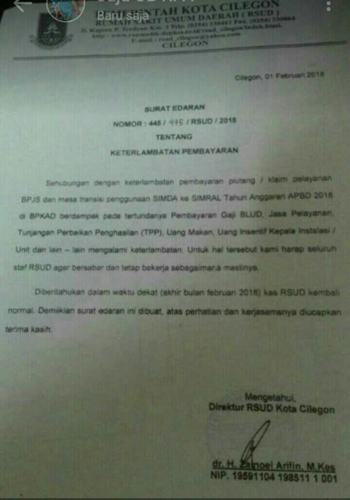 Pasalnya, beredar surat denga Nomor : 445/475/RSUD/2018 tentang informasi keterlambatan pembayaran gaji pegawai yang ditandatangani oleh Dirut RSUD Cilegon, dr Zaenoel Arifin per tanggal 1 Februari 2018.