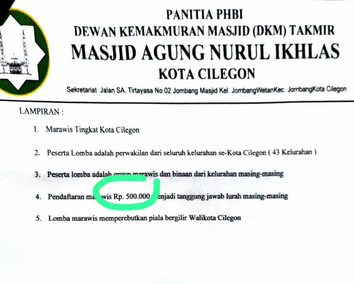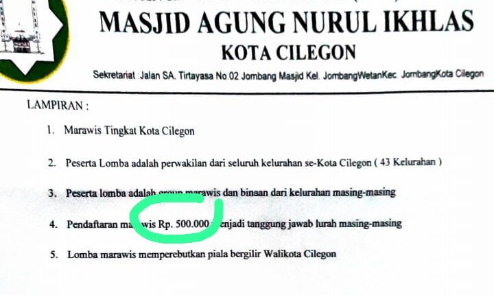 CILEGON – Peringatan Maulid Nabi Muhammad SAW di Masjid Agung Nurul Ikhlas Kota Cilegon yang digagas panitia dengan menghadirkan beragam lomba bernuansa religius, menuai sorotan setelah muncul polemik terkait biaya pendaftaran lomba marawis.