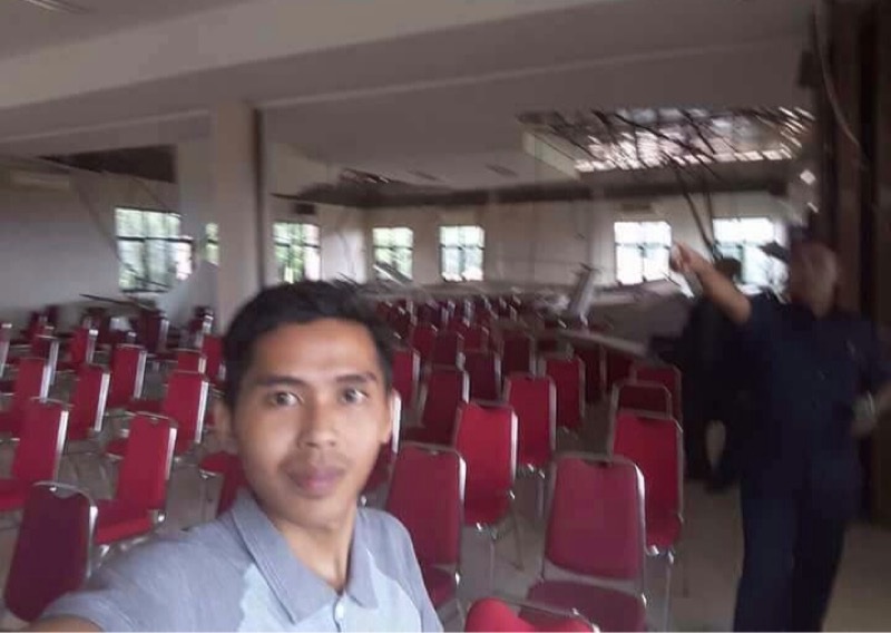 3. Postingan foto orang selfie di dalam ruangan gedung yang beberapa bagiannya mengalami runtuh.