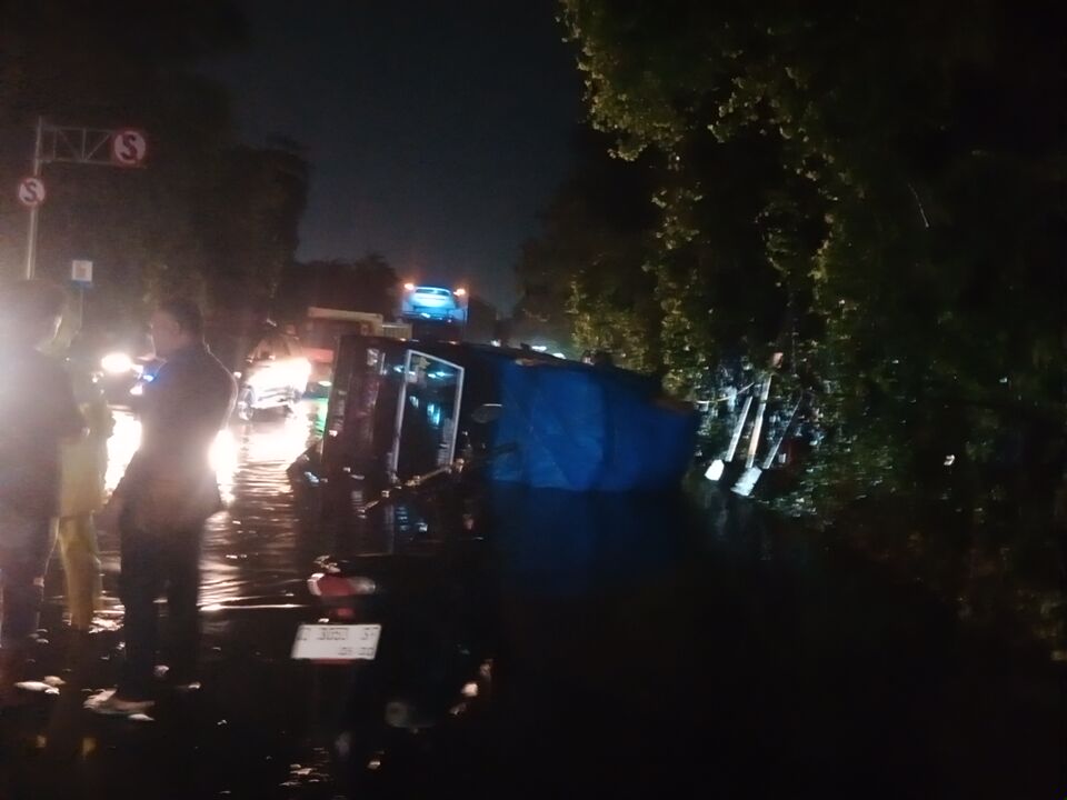 “Pas kena genangan air yang ternyata berlubang, mobil tiba-tiba nggak bisa digas karena lubangnya dalam. Nggak lama langsung miring ke kiri dan terguling. Untung sayurannya nggak berhamburan karena pakai terpal,” ujar seorang warga yang melintas di lokasi kejadian.
