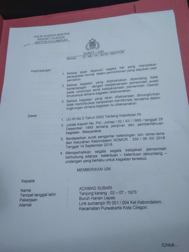 Ketika dikonfirmasi perihal perijinan dan kegiatan yang disponsori oleh Perusahaan Rokok, Ujang Suhardi, Ketua RW 04, mengatakan bahwa perijinan sudah didapat mulai dari Polsek Pulomerak dan pemilik kawasan yakni PT KIEC.