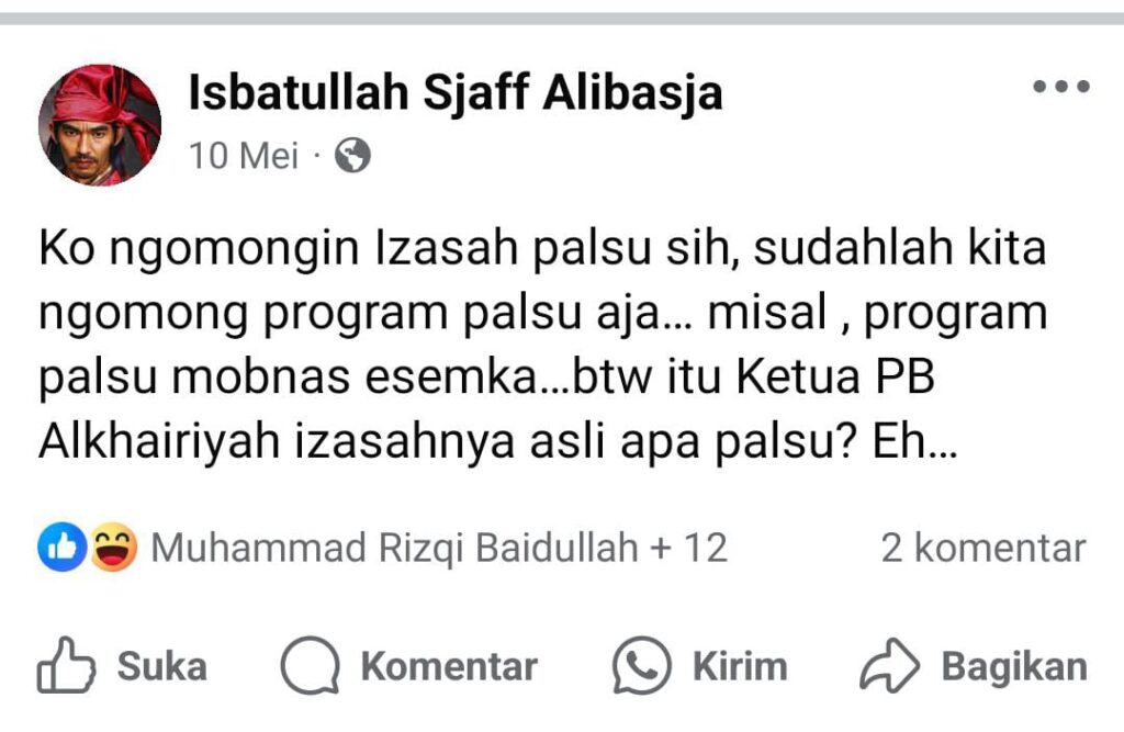 “Ko ngomongin Izasah palsu sih, sudahlah kita ngomong program palsu aja… misal, program palsu mobnas esemka…btw itu Ketua PB Alkhairiyah izasahnya asli apa palsu? Eh,” tulis akun Isbatullah Sjaff Alibasja.
