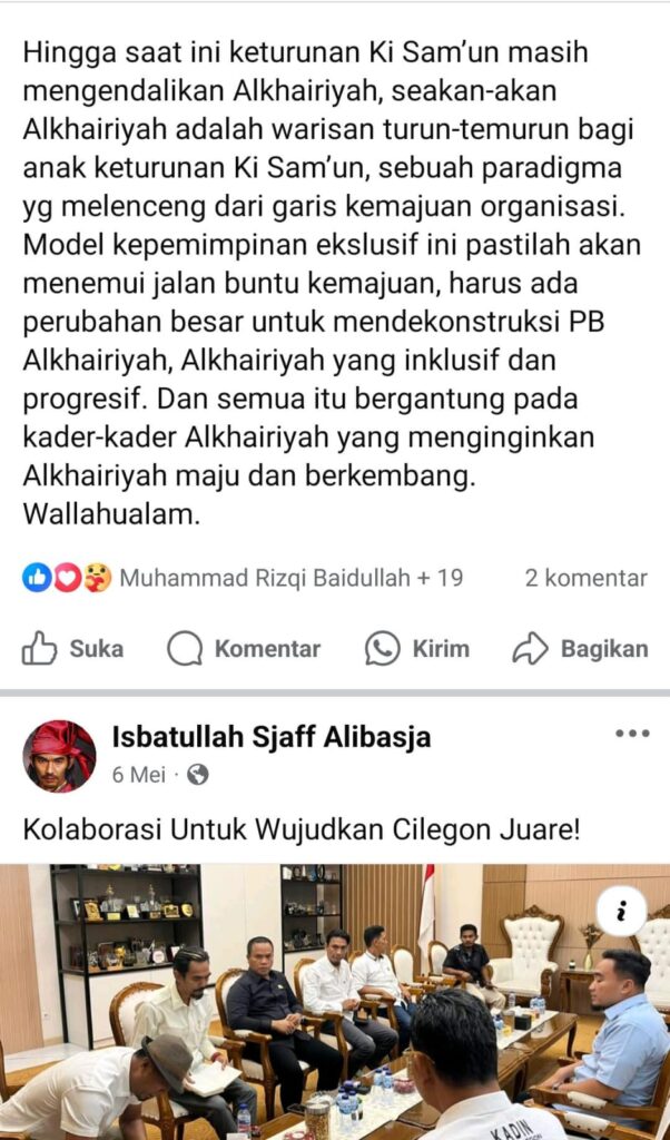 “Hingga saat ini keturunan Ki Sam’un masih mengendalikan Alkhairiyah, seakan-akan Alkhairiyah adalah warisan turun-temurun bagi anak keturunan Ki Sam’un, sebuah paradigma yg melenceng dari garis kemajuan organisasi,” tulisnya.