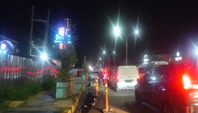 Kondisi itu menyebabkan arus kendaraan yang sebelumnya lancar, khususnya dari Tugu Baja hingga kawasan Ramayana, menjadi tersendat saat memasuki depan gerai Mie Gacoan.