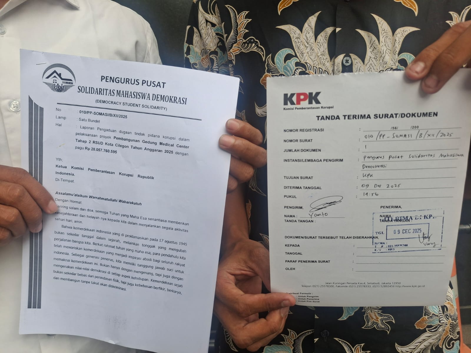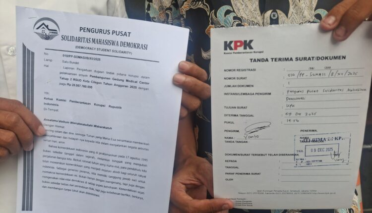 CILEGON – Sekelompok mahasiswa yang tergabung dalam Solidaritas Mahasiswa Demokrasi (SDM) melaporkan Direktur RSUD Kota Cilegon ke Komisi Pemberantasan Korupsi (KPK) terkait dugaan permainan proyek pembangunan Gedung Medical Center Tahap 2, Selasa (9/12/2025).