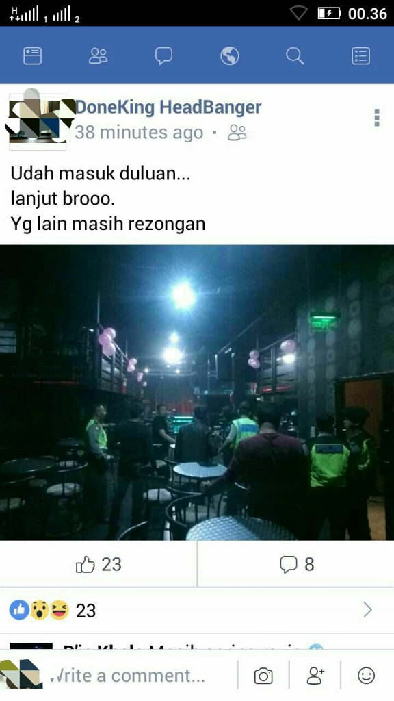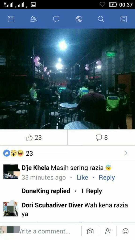 Bahkan akun yang memposting foto tersebut (@DoneKing HeadBanger) dalam beberapa balasan komentarnya secara jelas mengatakan aktivitas hiburan malam dilanjutkan kembali sesudah petugas yang melakukan razia pergi: “Iya bang…tapi udah lanjut lagi”, “Udah lanjut”