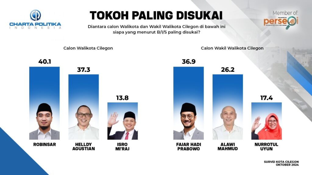 Survei Charta Politika juga memotret tingkat kesukaan masyarakat Cilegon terhadap pasagan calon Wali Kota dan calon Wakil Wali Kota Cilegon. Survei dilakukan pada 3–9 Oktober 2024.