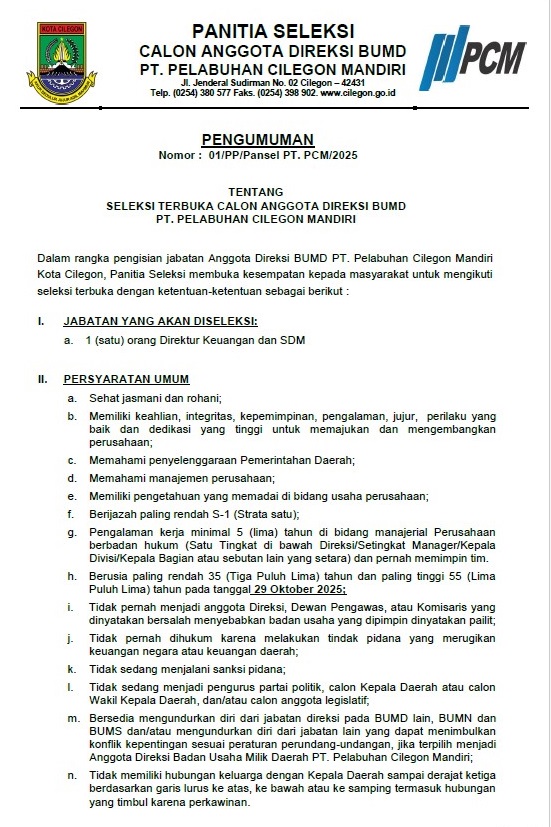 Dokumen selengkapnya Pengumuman Seleksi PT Pelabuhan Cilegon Mandiri (PCM) bisa klik link di sini Pengumuman Seleksi PCM Fixed