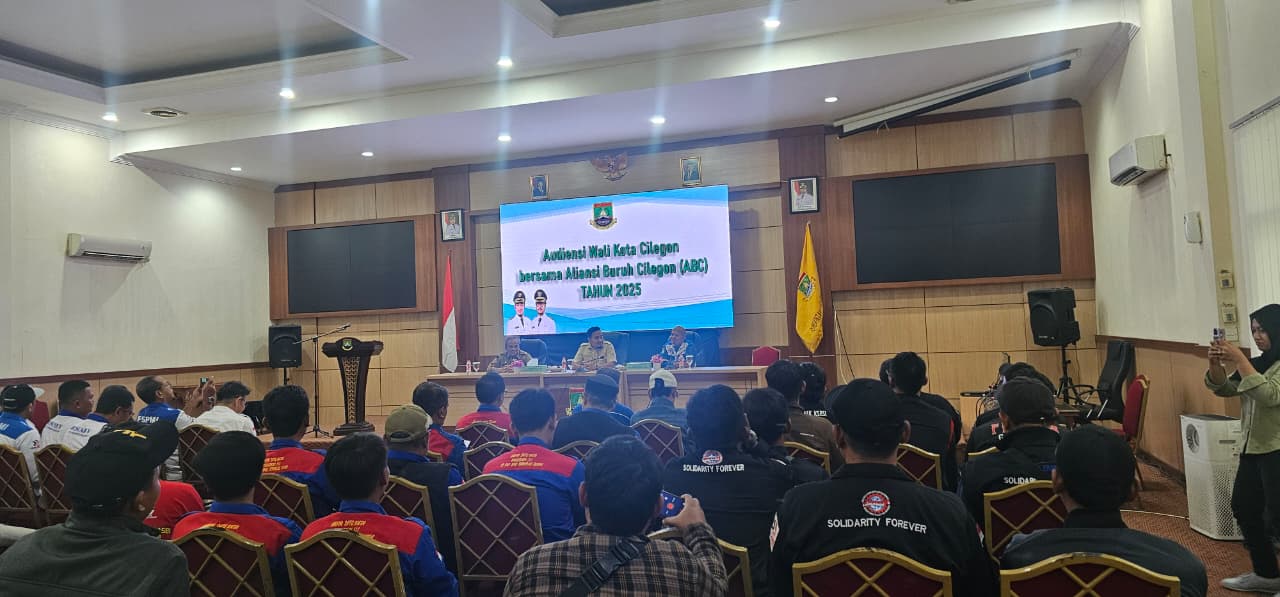 CILEGON — Aliansi Buruh se-Kota Cilegon menyampaikan apresiasi terhadap Pemerintah Kota Cilegon atas pola komunikasi dan respons pemerintah daerah dalam menangani isu ketenagakerjaan selama satu tahun masa kepemimpinan Robinsar – Fajar di Ruang Rapat Sekretariat Daerah (Setda) Kota Cilegon, Senin (29/12/2025).