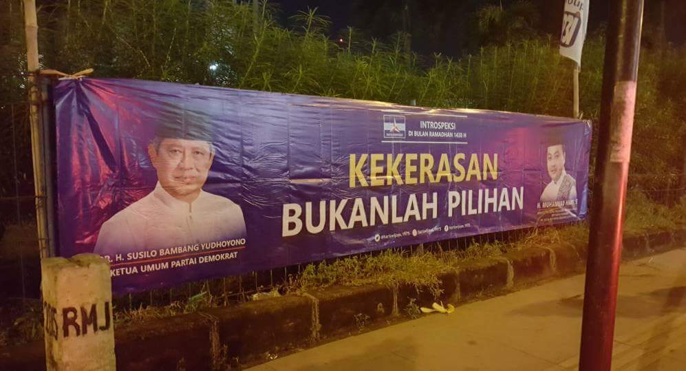 Di bawah tulisan nama SBY disematkan tulisan ‘Kekerasan Bukan Pilihan’ atau ‘Mendapatkan Secukupnya itu Barokah, Mengambil Semuanya itu Serakah’