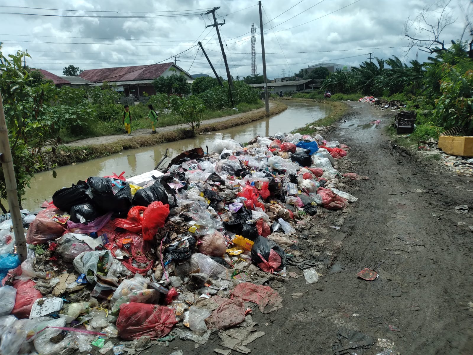 Tumpukan sampah itu berada di sisi jalan dan bantaran saluran irigasi, sehingga dikhawatirkan dapat mencemari aliran air serta mengakibatkan banjir.