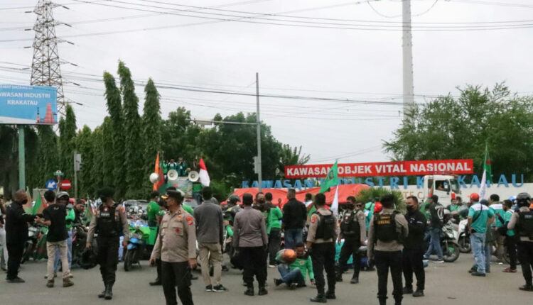 Ratusan buruh mulai bergerak sejak pagi tadi, dari mulai pabrik Chandra Asri dan tiba di lampu merah depan pintu masuk kawasan Industri Krakatau sekira pukul 12.30 WIB.