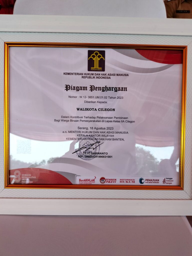 CILEGON – Walikota Cilegon Helldy Agustian kembali meraih penghargaan tingkat Nasional. Kali ini, penghargaan diberikan oleh Kementerian Hukum dan Hak Asasi Manusia (Kemenkumham) Republik Indonesia pada peringatan Hari Kementerian Hukum dan Hak Asasi Manusia Republik Indonesia yang ke-78 di Lapangan Lapas Anak Kota Tangerang, Senin 21 Agustus 2023.