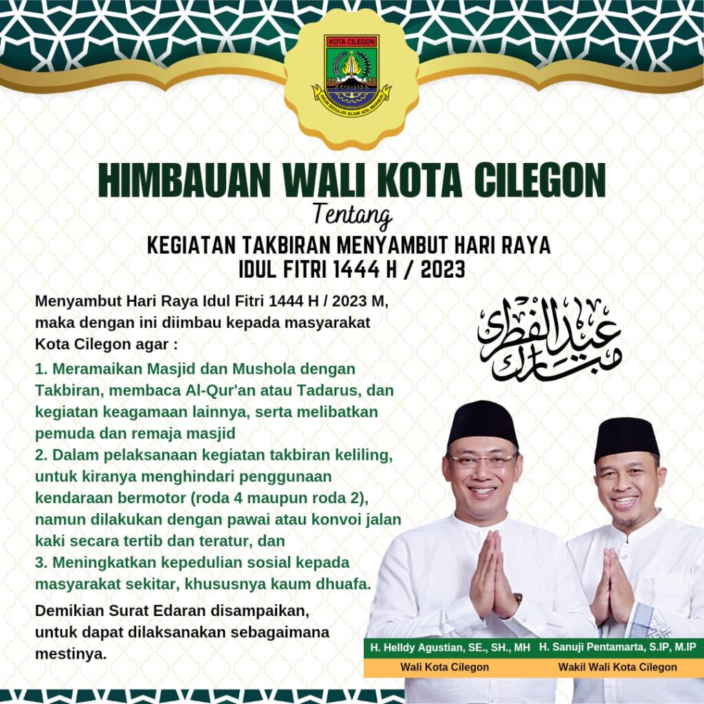 Imbauan Walikota Cilegon yang spesifik mengatur Kegiatan Takbiran Menyambut Idul Fitri 1444 Hijriyah ini diposting di media sosial @pemkotcilegon, Kamis (20/4/2023).