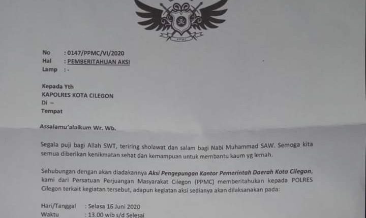“Segala puji bagi Allah SWT, teriring Shalawat dan Salam bagi Nabi Muhammad SAW semoga kita semua diberikan kenikmatan sehat dan kemampuan untuk membantu kaum yang lemah. Sehubungan dengan akan diadakannya Aksi Pengepungan Kantor Pemerintah Daerah Kota Cilegon, kami dari Persatuan Perjuangan Masyarakat Cilegon (PPMC) memberitahukan kepada Polres Cilegon terkait kegiatan tersebut. Adapun kegiatan aksi sedianya akan dilaksanakan pada Selasa (16/6/2020) pukul 13.00 WIB. Dengan estimasi massa sebanyak 779 orang,” sebagaimana tertulis dalam surat tersebut.