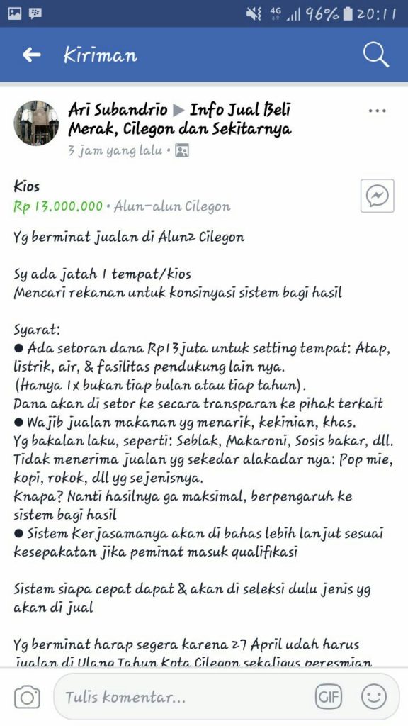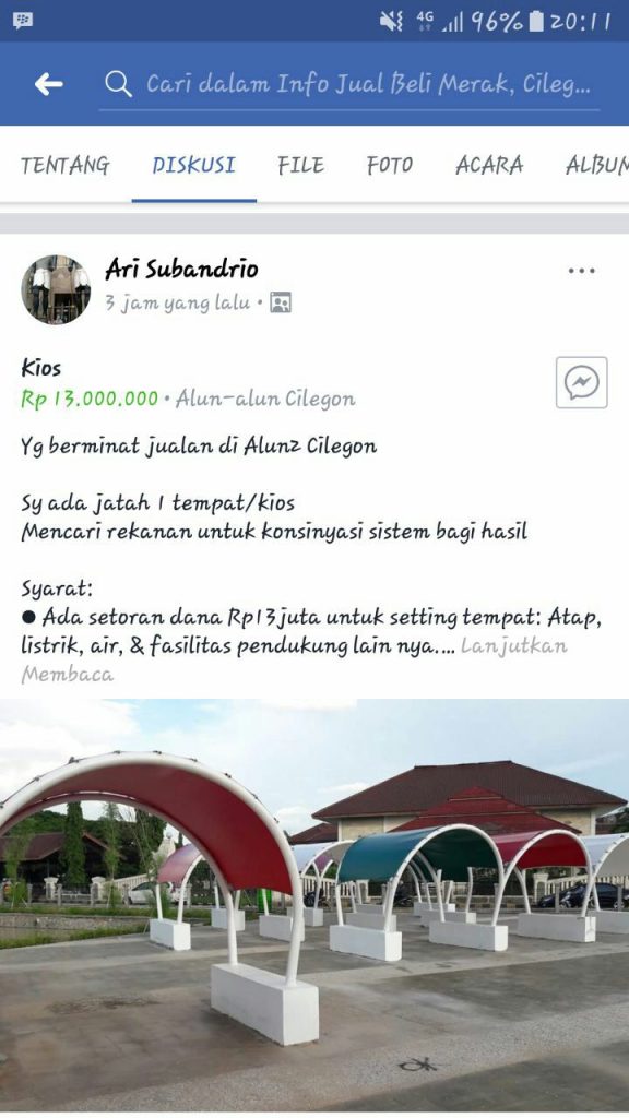 “Kios Rp 13.000.000 Alun-alun Cilegon. Yg berminat jualan di Alun2 Cilegon,” tulis Ari pada status yang ditulisnya, Jumat (16/2/2018).