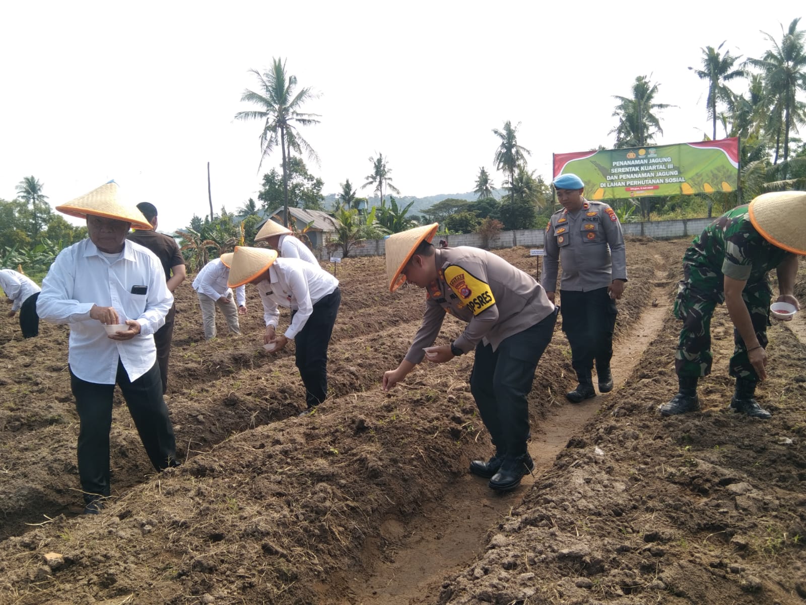 “Yang saya hormati rekan-rekan semua, saat ini kami bersama Forkopimda Kota Cilegon, Kepala Dinas Pertanian, perwakilan Kodim, Bulog, kelompok tani, serta masyarakat sekitar lahan malakukan penanaman jagung,” ujar AKBP M. Silitonga.