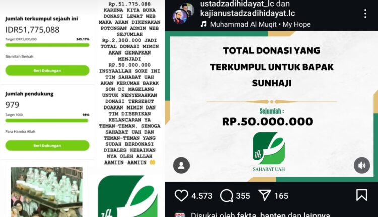 “Alhamdulillah, donasi sudah terkumpul sebesar Rp 51 juta. Setelah dipotong biaya administrasi, total donasi yang akan kami serahkan adalah Rp 50 juta. InsyaAllah sore ini, Tim Sahabat UAH akan menyerahkan langsung bantuan ini ke rumah Bapak Sonhaji di Kecamatan Grabag, Magelang,” tulis akun @ustadzadihidayat_lc dalam unggahan resmi pada insta storynya, Rabu (4/12/2024).
