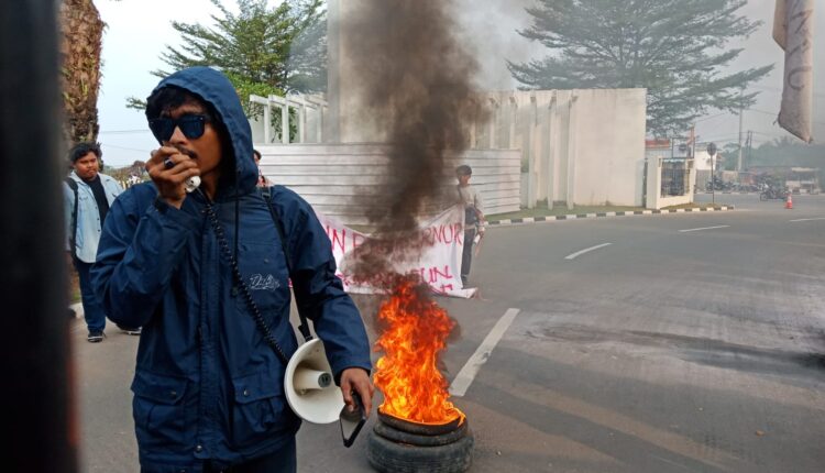 SERANG – Komunitas Soedirman (KMS) 30 menggelar aksi demonstrasi di halaman Kawasan Pusat Pemerintahan Provinsi Banten (KP3B), Curug, Kota Serang, pada Rabu, (10/5/2023).