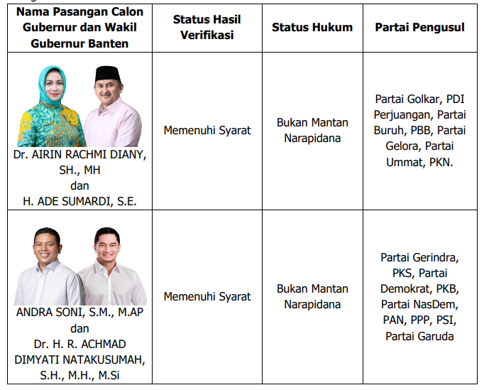 PENGUMUMAN: Hasil Penelitian Persyaratan Administrasi Calon Gubernur dan Wakil Gubernur Banten Dalam Pilkada 2024