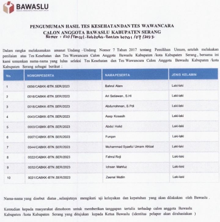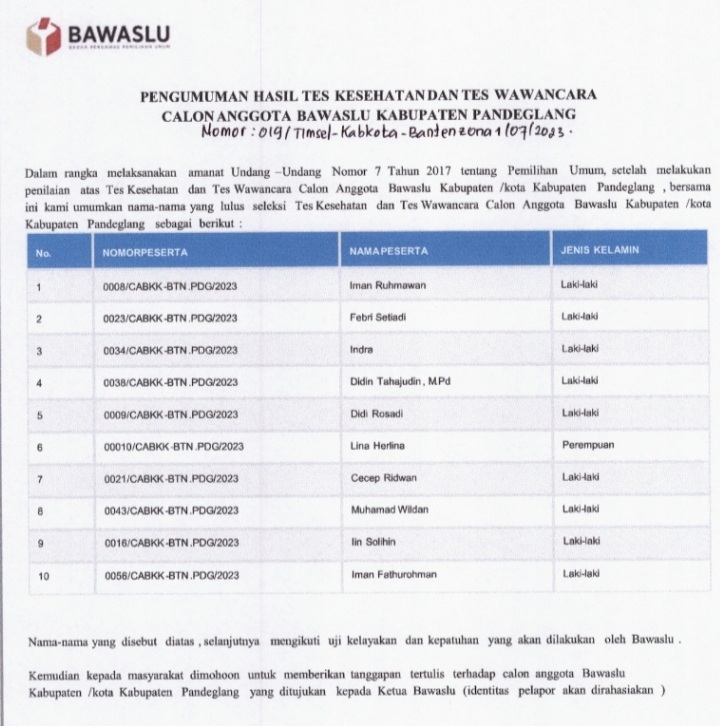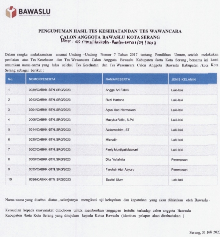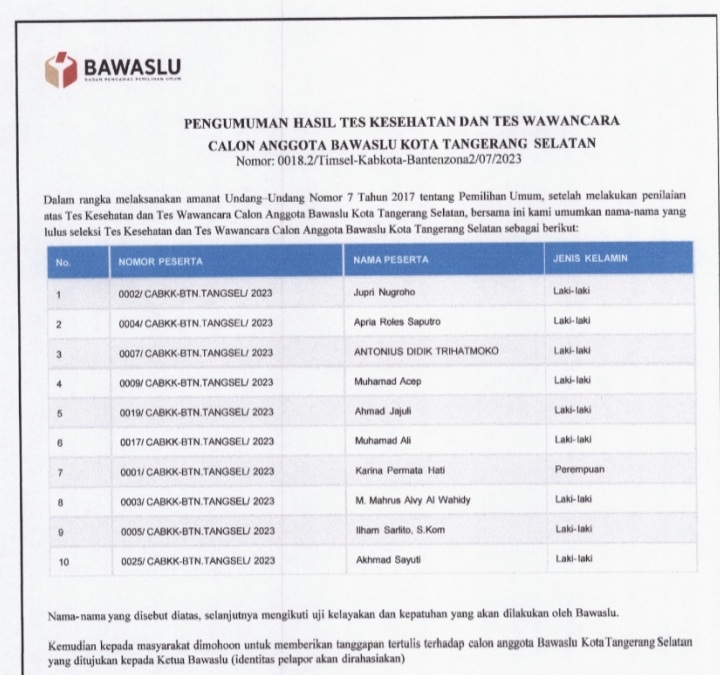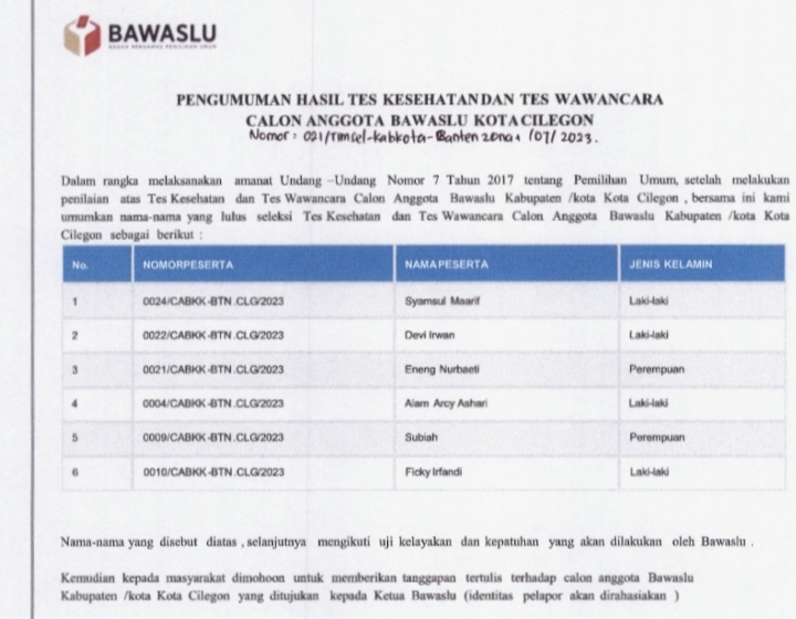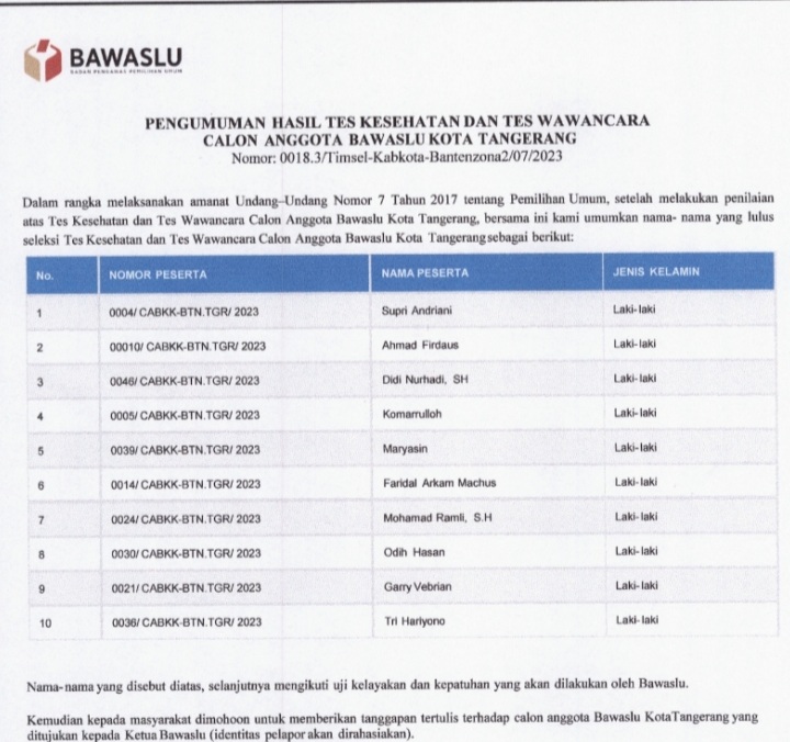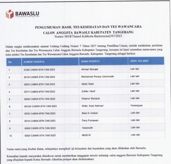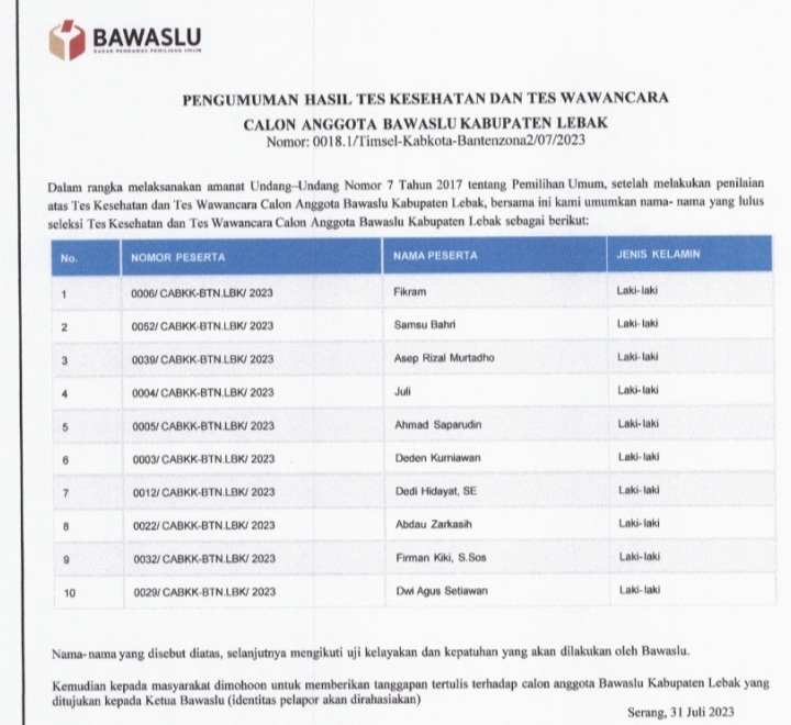 SERANG – Timsel Bawaslu kabupaten/kota Provinsi Banten zona satu dan dua telah mengumumkan hasil tes kesehatan dan wawancara pada Selasa, (1/8/2023).