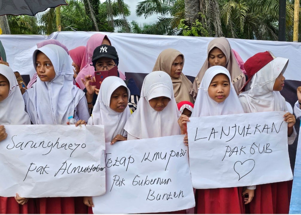 “Lanjutkan Pak Gub,” demikian kalimat singkat tertulis dalam karton yang dibawa anak SD.