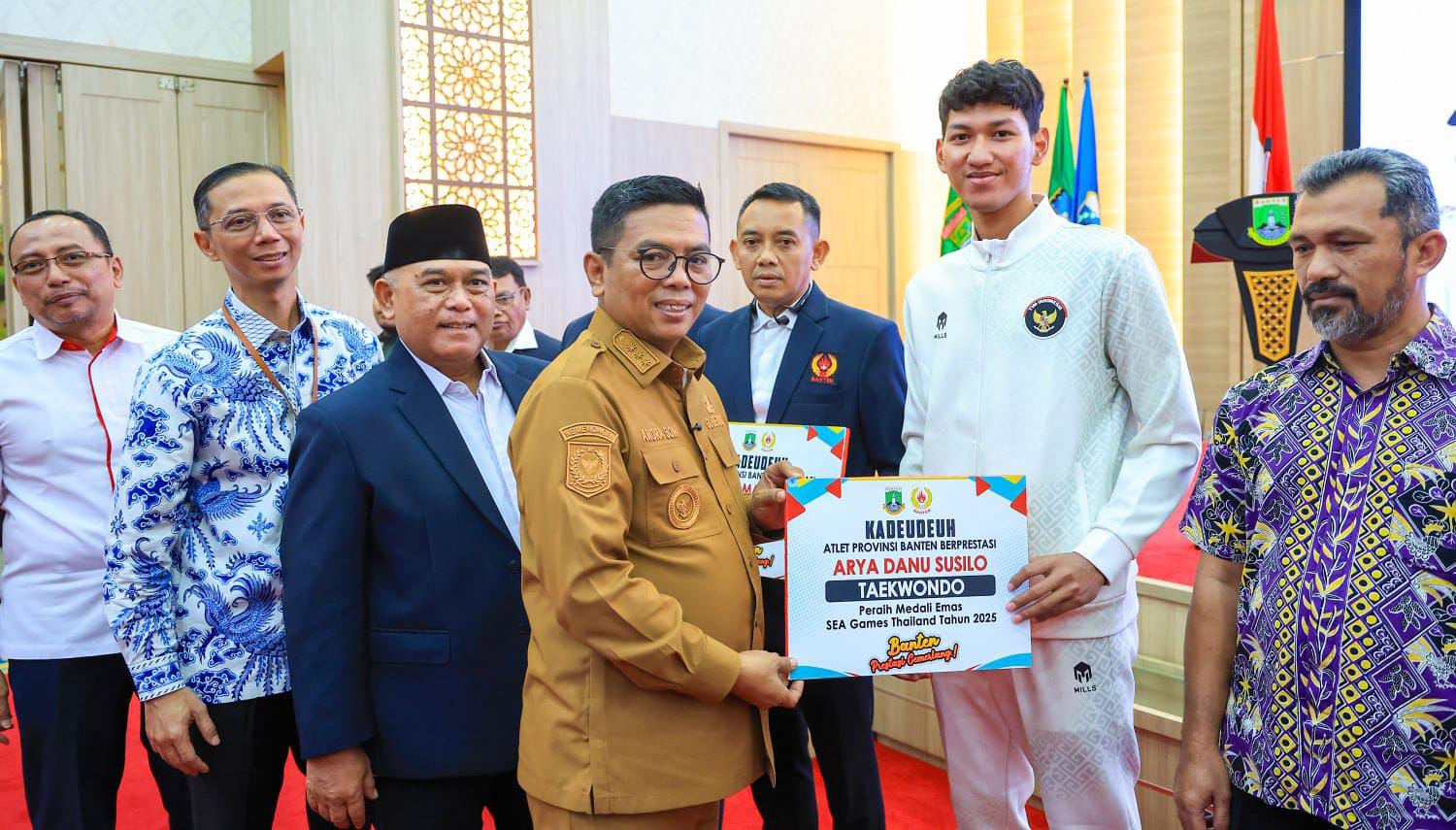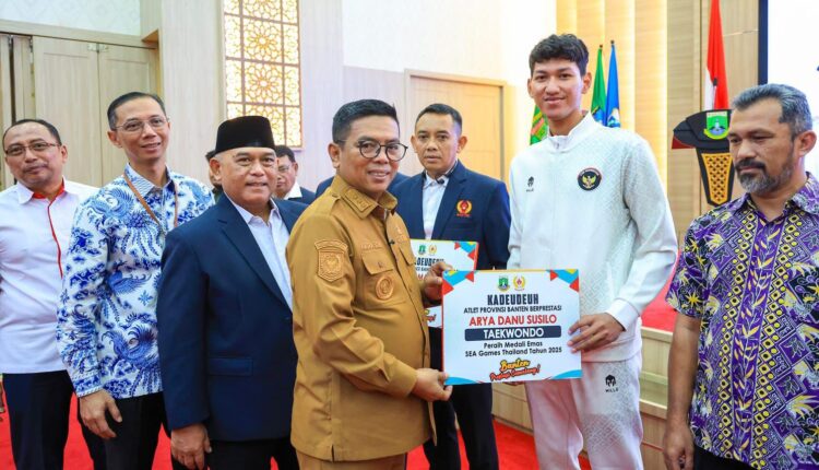 SERANG – Gubernur Banten Andra Soni memberikan apresiasi kepada para atlet asal Provinsi Banten yang telah berlaga pada ajang SEA Games 2025 di Thailand serta Pekan Olahraga Mahasiswa Nasional (Pomnas) 2025.