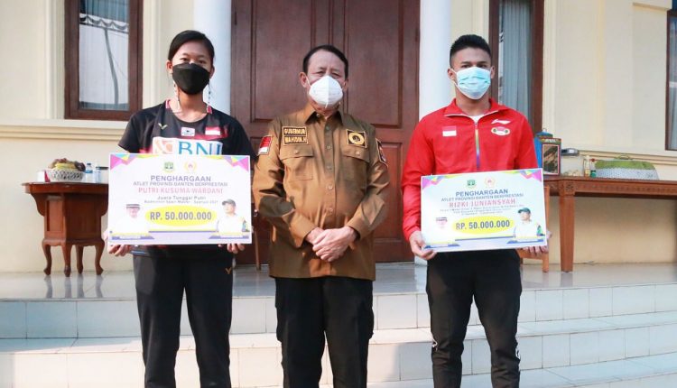 SERANG – Gubernur Banten Wahidin Halim (WH) memberikan apresiasi atas prestasi yang diraih atlet muda Provinsi Banten Rizki Juniansyah dan Putri Kusuma Wardani. Masing-masing menerima uang pembinaan Rp50 juta.