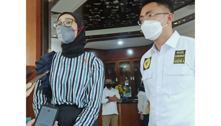 SERANG – Staf Khusus Presiden RI, Angkie Yudistia mengunjungi Wakil Gubernur Banten Andika Hazrumy di ruang kerjanya di Pendopo Gubernur Banten, Kawasan Pusat Pemerintahan Provinsi Banten (KP3B), Kota Serang, Rabu (1/9/2021).