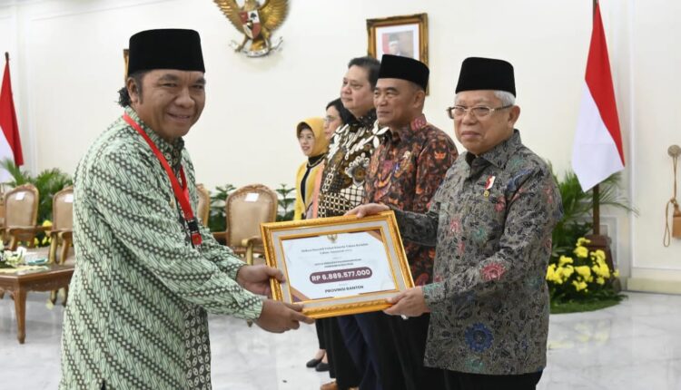 Penghargaan diterima Penjabat (Pj) Gubernur Banten Al Muktabar dari Wakil Presiden RI KH Ma’ruf Amin sebagai Ketua Tim Nasional Percepatan Penanggulangan Kemiskinan (TNP2K) pada Rapat Koordinasi Nasional dan Penyerahan Insentif Fiskal Tahun Berjalan Untuk Kategori Kinerja Penghapusan Kemiskinan Ekstrem Tahun 2023 di Istana Wakil Presiden, Jakarta, pada Kamis (9/11/2023).