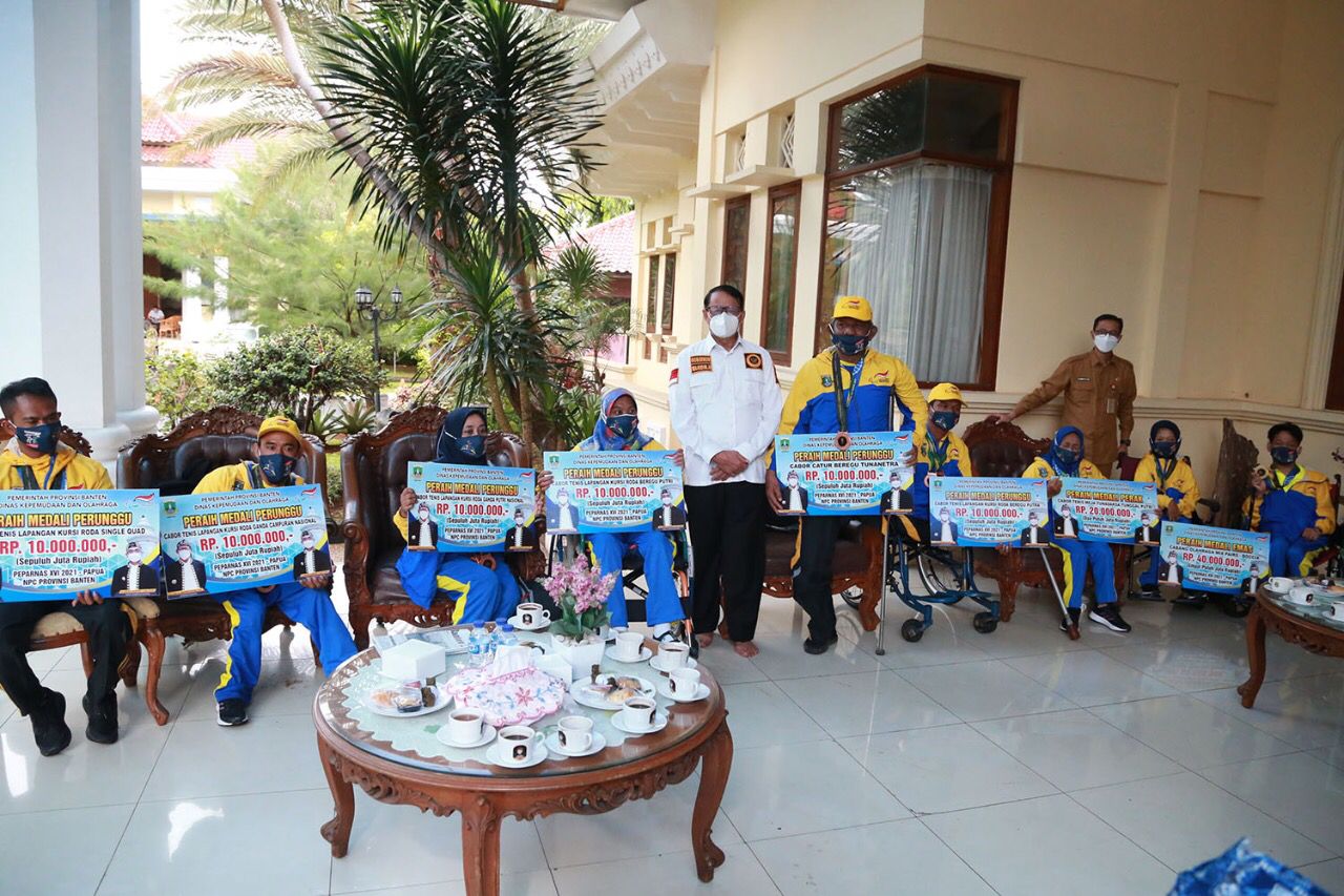 SERANG – Gubernur Banten, Wahidin Halim (WH) menyerahkan bonus kepada atlet Provinsi Banten peraih medali pada ajang Pekan Paralimpiade Nasional (Peparnas) XVI 2021 di Papua.